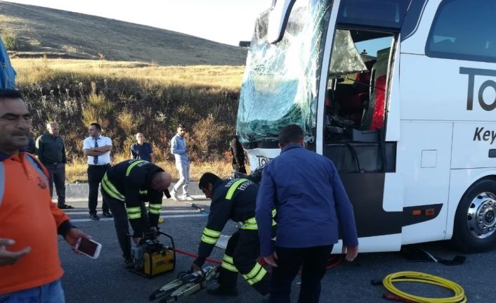 Erzurum-Aşkale karayolunda yolcu otobüsü ile tırın çarpışması sonucu meydana gelen trafik kazasında 4’ü ağır 17 kişi yaralandı.