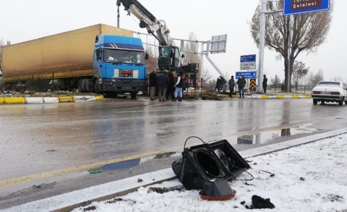 Erzurum’da etkili olan sis ve buzlanma beraberinde kazaları da getirdi. Yolda kayarak refüje çıkan tır, trafik ışıkları ve yön tabelalarına çarparak durdu.