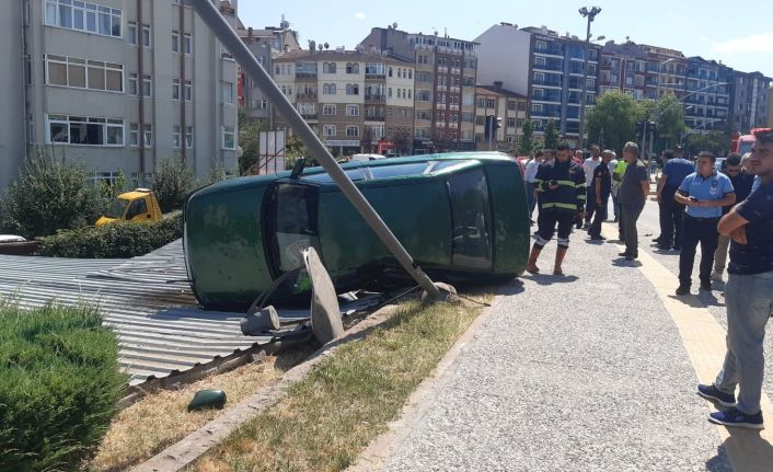 Kastamonu’da Taşköprü kavşağında sürücüsünün direksiyon hakimiyetini kaybettiği otomobil, aydınlatma direğini devirdikten sonra otoparkın çatısına uçtu.
