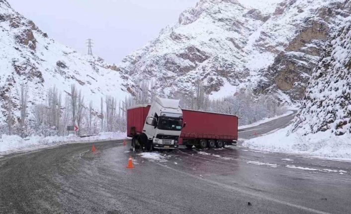 Erzurum’un Tortum ilçesi Derekapı mevkisinde Trabzon’dan İran’a gitmekte olan İran plakalı bir tır, buzlanma nedeniyle virajı alamayarak ters şeride dönüp makasladı.