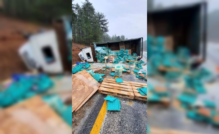 Bursa’nın Harmancık ilçesinde, yumurta yüklü kamyon devrildi, bir kişi öldü.
