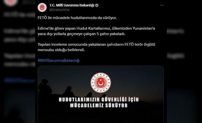 Milli Savunma Bakanlığının sosyal medya hesabından yapılan açıklamada, Türkiye’nin FETÖ ile mücadelesinin hudutlarda da devam ettiği vurgulanarak, “Edirne’de görev yapan Hudut Kartallarımız, ülkemizden Yunanistan’a yasa dışı yollarla geçmeye çalışan 5 şahsı yakaladı. Yapılan inceleme sonucunda yakalanan şahısların FETÖ terör örgütü mensubu olduğu belirlendi” ifadelerine yer verildi.