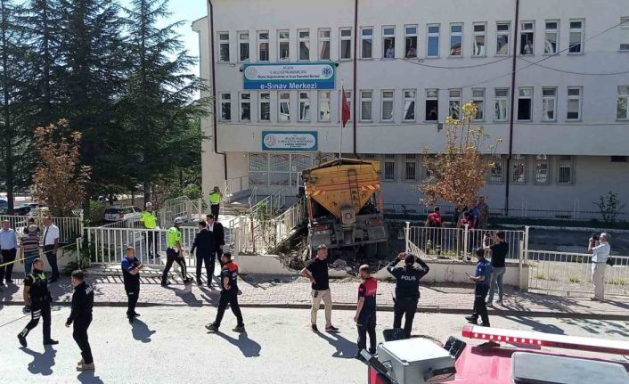 Bilecik’te freni tutmayan asfalt malzemesi yüklü kamyon E-Sınav Merkezi binası bahçesine dalarken, kaza anı bir apartmanın güvenlik kamerasına yansıdı.