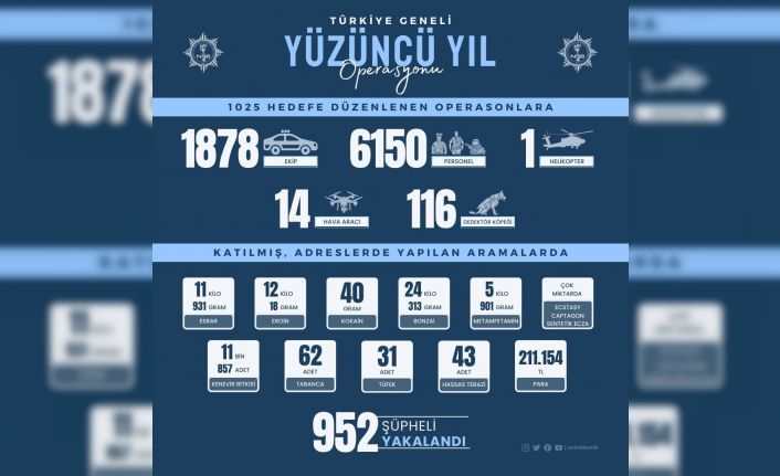 İçişleri Bakanı Ali Yerlikaya, sosyal medya hesabından yaptığı paylaşımda, “Zehir tacirlerine göz açtırmayacağız. Emniyet Genel Müdürlüğü Narkotik Suçlarla Mücadele Başkanlığımız koordinesinde, sokak satıcılarına yönelik Türkiye genelinde İl Emniyet Müdürlüklerimiz tarafından Yüzüncü Yıl Operasyonu gerçekleşti. Bin 25 hedefe yönelik düzenlenen operasyonlarda; bin 878 ekip, 6 bin 150 personel, 1 helikopter, 14 hava aracı ve 116 narkotik dedektör köpeği görev aldı. 952 şüpheli yakalandı. Ayrıca çok sayıda muhtelif uyuşturucu madde, silah ve hassas terazi ele geçirildi” ifadelerine yer verdi.