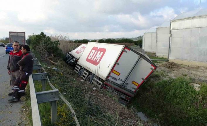 Kaza; Manavgat-Antalya D-400 Karayolunda meydana geldi. Edinilen bilgiye göre; Antalya istikametine gitmekte olan Murat Güney’in kullandığı 34 JC 0852 plakalı BİM markete ait tır, çelik bariyerlerin üzerine çıkarak yol kenarında bulunan sulama kanalına devrildi.