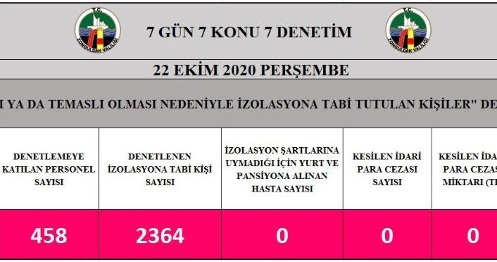 Zonguldak’ta il genelinde salgın denetim merkezince 148 ekip ve 458 personel tarafından izolasyona tabi tutulan 2 bin 364 kişiye denetleme gerçekleştirildi.