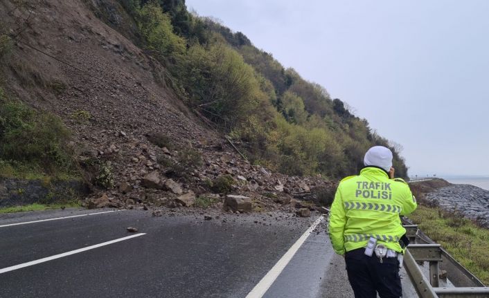 Zonguldak’ın Alaplı ilçesinde yağmurun ardından yumuşayan zeminden kopan kaya ve toprak parçaları karayolunu ulaşıma kapattı.