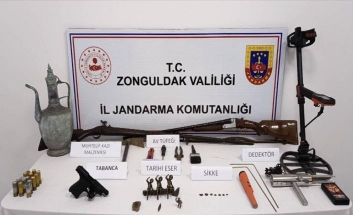 Zonguldak’ta düzenlenen operasyonda tarihi eser niteliği taşıyan objeler, dedektörler ve ruhsatsız silahlar ele geçirildi.
