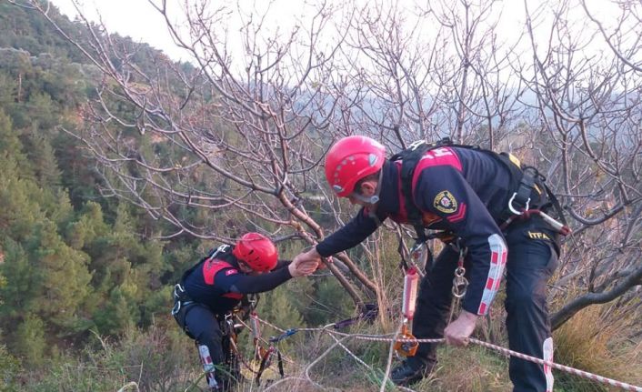 Aydın’ın Efeler ilçesinde uçurumda mahsur kalan keçi itfaiye ekiplerinin iki saatlik çalışmasının ardından kurtarıldı.