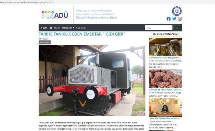 ADÜ İletişim Fakültesi Gazetecilik Bölümü tarafından Genel Yayın Yönetmenliğini Doç. Dr. Ali Emre Dingin, Yazı İşleri Müdürlüğünü Dr. Öğr. Üyesi Hicabi Arslan, Editörlüğünü ise Öğretim Görevlisi Aslıhan Topal’ın üstlendiği e-gztADÜ haber sitesi olan gzt.adu.edu.tr adresinde ve ADÜDergi 2021 yılında öğrencilerin uygulama yapması ve öğrencilerin yarışmalara katılmaları amacı ile kuruldu. Gazetecilik Bölümü haber sitesi e-gztADÜ’de yayınlanan haberde, ADÜ Sümer Kampüsü alanı içinde kalan tarihi Sümerbank Basma Fabrikasının işçileri taşıdığı tren ‘Gıdı Gıdı’nın hikayesini konu alıyor.