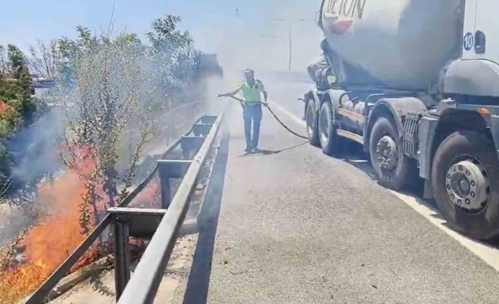 Aydın-Denizli Otobanı Çevreyolu kenarında çıkan ot yangınına ilk müdahaleyi Aydın İl Emniyet Müdürlüğü Bölge Trafik Denetleme Şube Müdürlüğü ekipleri yoldan geçen beton mikserini durdurarak yaptı.