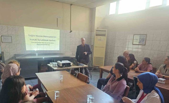 Aydın İl Sağlık Müdürlüğü Hukuk ve Muhakemat biriminde görevli avukatlar ile Mesleki Sorumluluk Kurulu İl Koordinatörü tarafından verilen eğitimde, sağlık çalışanlarının mesleki sorumlulukları ve hukuki süreçlerde izlenecek yollar detaylı şekilde ele alındı. Eğitim kapsamında, özellikle rücu işleyişi, idari ve hukuki sorumluluklar ile sağlık çalışanlarının görevlerini yerine getirirken dikkat etmesi gereken hususlar hakkında bilgilendirme yapıldı. Katılımcılara, karşılaşılabilecek hukuki durumlarda izlenecek prosedürler örnekler üzerinden anlatıldı.