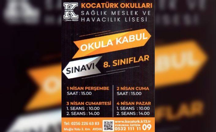 Aydın Özel Kocatürk Mesleki ve Teknik Anadolu Lisesi, okul kayıt ve bursluluk sınavlarının tarihlerini açıkladı. 8. sınıfta eğitim-öğrenimini sürdüren tüm öğrencilerin katılabileceği sınavların 01-04 Nisan tarihleri arsında gerçekleştirileceği açıklandı. Sınavlarda başarılı olan öğrencilere burs verileceği de belirtildi.