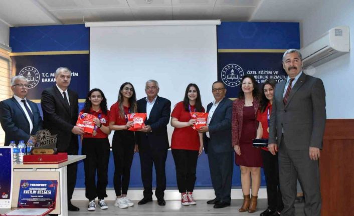 Sunumun ardından Aydın Ticaret Borsası Meclis Başkanı A.Bahri Erdel, Yönetim Kurulu Başkan Yardımcısı Cengiz Ülgen ve Aydın İl Milli Eğitim Müdürü Seyfullah Okumuş, Türkiye birincisi olan Aydın Ticaret Borsası Bilim ve Sanat Merkezi öğrencileri Elif Buse Bardak, Elif Köklüce ve Yasemin Vapur ile danışman öğretmenleri Ceren Aydın’ ı başarılarından dolayı tebrik ederek ödüllendirdi.