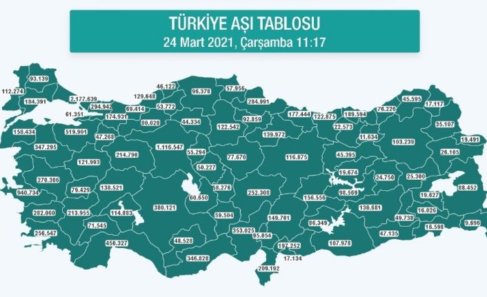 Sağlık Bakanlığın resmi internet sitesinde, 24 Mart Çarşamba günü verilerine göre ülke genelinde toplam 13 milyon 978 bin 521 aşı yapıldı. Türkiye aşı tablosuna bakıldığında ise Aydın’da 163 bin 066 birinci doz, 118 bin 994 ikinci doz olmak üzere toplam 282 bin 060 aşı uygulaması yapıldı.