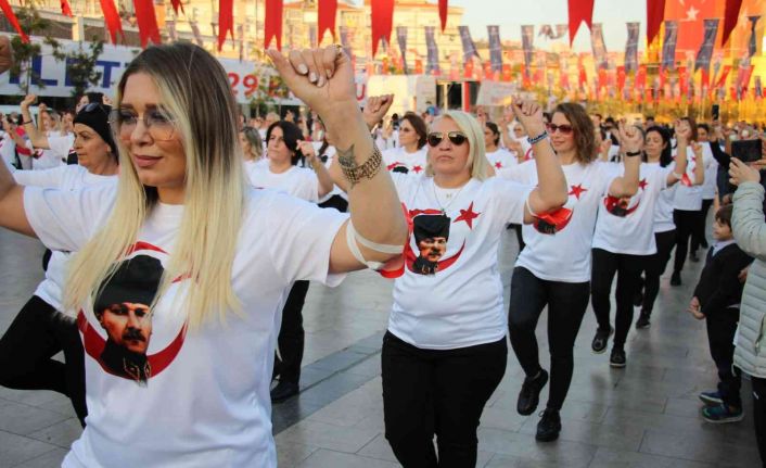 Gazi Mustafa Kemal Atatürk’ün resminin yer aldığı tişörtleri giyen 98 kadının zeybek gösterisine çok sayıda vatandaş da ellerindeki Türk bayraklarıyla kadınlara destek verdi. Şölen havasında geçen etkinlikte kadınlar, marşlar eşliğinde Cumhuriyet Bayramı’nı kutlarken, vatandaşlar da çektikleri fotoğraf ve videolar ile anı ölümsüzleştirdi.