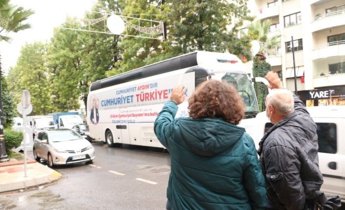 Aydınlılar, ilçe ilçe gezen Büyükşehir Belediyesi otobüsünden çalınan marşlarla Cumhuriyetin ilanının 97. yıldönümünün coşkusuna ortak oldu.