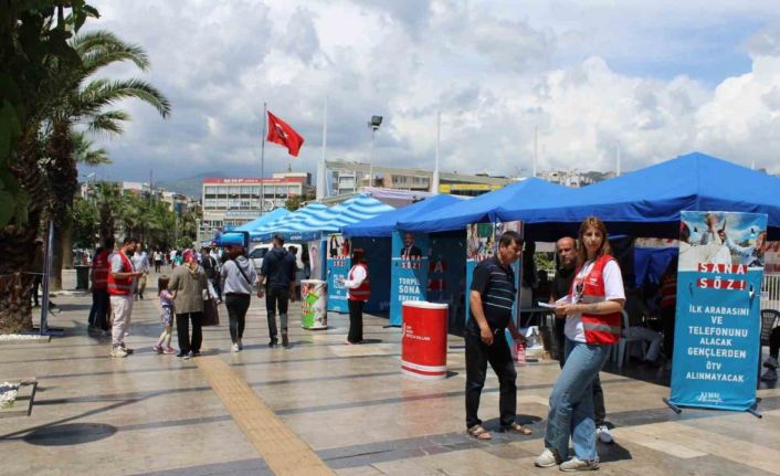 Atatürk Kent Meydanı’nda açılan stantlarda yerini alan partililer giydikleri parti yeleği ve ellerine aldıkları broşürler ile cumhurbaşkanı adaylarının vaatlerini bölgeden geçen vatandaşlara anlatıyor.