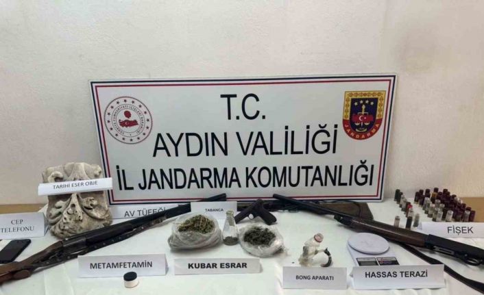 Aydın İl Jandarma Komutanlığı Narkotik Suçlarla Mücadele Şube Müdürlüğü ile Sultanhisar İlçe Jandarma Komutanlığı ekiplerince, uyuşturucu ile mücadele kapsamında operasyon gerçekleştirildi. Edinilen bilgiye göre Nazilli ilçesi Karaçay Mahallesi ile Sultanhisar ilçesi Eskihisar Mahallesi’nde A.H. (61) isimli şahsa ait 5 ayrı adreste eş zamanlı arama gerçekleştirildi. Yapılan aramalarda 498 gram kubar esrar, 3 gram metamfetamin, dijital hassas terazi, 1 adet ruhsatsız tabanca, 16 adet fişek, 3 adet ruhsatsız av tüfeği, 29 adet av tüfeği fişeği, Roma dönemine ait tarihi obje, 1 adet cep telefonu, uyuşturucu kullanma aparatı ele geçirildi. Olayla ilgili olarak şüpheli şahıs gözaltına alınırken, hakkında adli işlem başlatıldı.