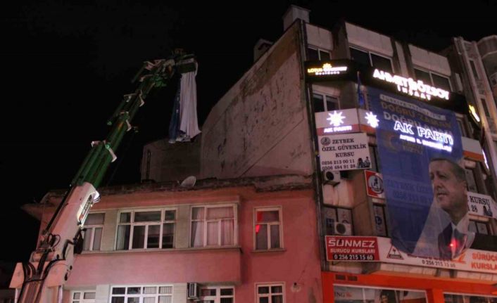 Aydın’ın Efeler ilçesinde AK Parti İl Başkanlığının bulunduğu binanın yan cephesine asılan ve krize neden olan CHP pankartı İl Seçim Kurulu kararı ile kaldırıldı.