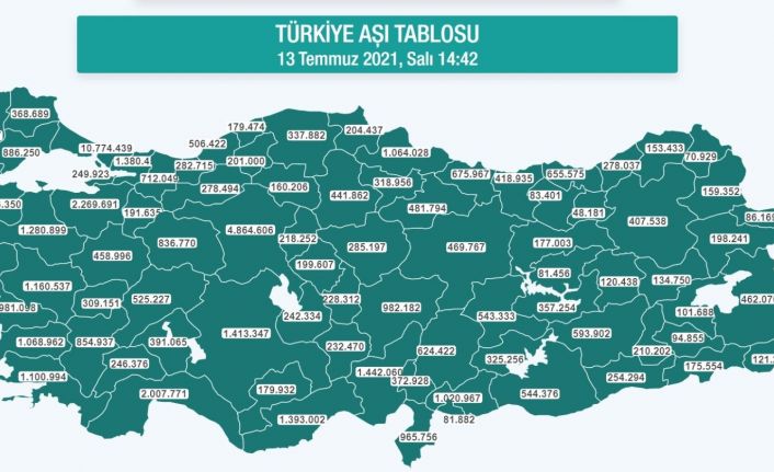 Sağlık Bakanlığı resmi internet sitesinde, 13 Temmuz Salı günü verilerine göre ülke genelinde toplam 59 milyon 273 bin 510 aşı yapıldı. Türkiye geneli aşı tablosuna bakıldığında ise aşılama yüzde en iyi 8. il konumunda olan Aydın’da 633 bin 400 kişiye birinci doz, 347 bin 309 kişiye de ikinci doz olmak üzere toplam 1 milyon 68 bin 962 aşı vuruldu.