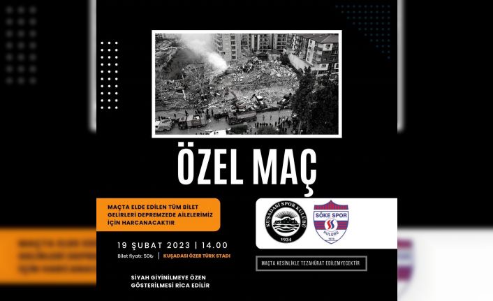 Kahramanmaraş merkezli 7.7 ve 7.6 şiddetinde 2 depremin ardından Türkiye seferber oldu. Bütün il ve ilçelerden yardım tırları bölgeye sevk edildi. Depremzedeler ise Türkiye’nin dört bir yanına yerleştirildi. Aydın’ın en köklü kulüplerinden 3’üncü ligde bulunan Kuşadasıspor ve Bölgesel Amatör Ligi’nde bulunan Sökespor deprem yaralarını sarmak için pazar günü saat 14.00’da Kuşadası Özer Türk Stadyumu’nda karşı karşıya gelecek. Türkiye Futbol Federasyonu’ndan özel izin alan kulüpler, maç bilet fiyatını 50 TL olarak belirledi. Maçta elde edilecek bilet gelirlerinin tamamı depremzedeler için bağışlanacağı açıklandı. Kuşadasıspor ve Sökespor taraftarları ortak karar ile kapalı tribünde beraber olacakları ve hiçbir tezahüratta bulunmayacağını açıkladı. Bu güzel hareket ise her iki ilçenin vatandaşları tarafından takdirle karşılandı. Duygu yüklü bir maç olacak olan karşılaşmada Kuşadası Özer Türk Stadyumu’nun dolacağı düşünülüyor.