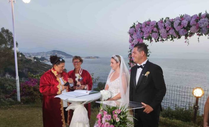 Aydın Büyükşehir Belediye Başkanı Özlem Çerçioğlu’nun yeğeni Halil Kahyaoğulları, Kuşadası’nda gerçekleştirilen törenle dünya evine girerken, genç çiftin nikahını Başkan Özlem Çerçioğlu kıydı.