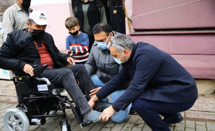 Akülü sandalyesinin aküsü bittiği için uzun zamandır dışarıya çıkıp gezemeyen felçli Murat Bozkurt’un yardımına Başkan Çerçioğlu koştu.