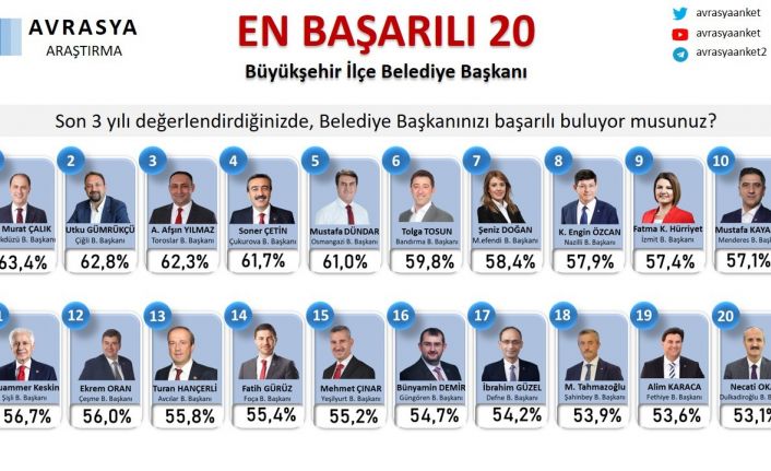 AYDIN (İHA) – Nazilli Belediye Başkanı Kürşat Engin Özcan, Avrasya Araştırma Şirketi tarafından yapılan en başarılı 20 Büyükşehir İlçe Belediye Başkanı araştırmasında yüzde 57,9 ile zirvedeki yerini korudu.