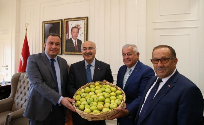 İzmir Valisi Yavuz Selim Köşger’i ziyaret eden Aydın Ticaret Borsası yönetimi, sezonun ilk yaş incirini takdim etti.