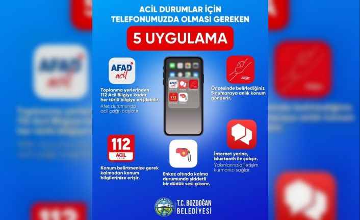 Bozdoğan Belediyesi, özellikle deprem gibi acil durumlar için vatandaşların telefonlarında mutlaka bulunması gereken 5 önemli uygulamayı paylaşarak bu uygulamaların afet anlarında hızla müdahale edilmesini ve güvenliğin sağlanmasını kolaylaştıracağını belirtti.