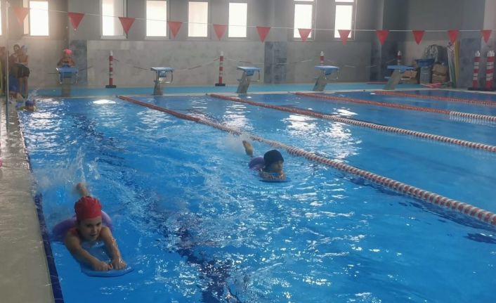 Aydın’ın Bozdoğan ilçesinde faaliyete geçen yarı olimpik yüzme havuzunda eğitim gören çocuklar hem eğleniyor hem de yüzme öğreniyor.