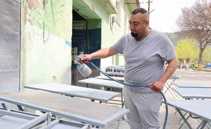 Havaların ısınmasıyla birlikte düğün sezonu açılırken, cemiyetlerin vazgeçilmezi olan demir masalar da Aydın’ın Koçarlı ilçesinde boyanarak yeni sezona hazırlanıyor.