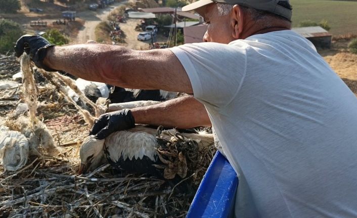 Hayvan samanlarını bağlamakta kullanılan plastik siyah iplerin, çok sayıda leylek yavrusunun ölümü veya yaralanmasına sebep olduğunu ifade eden Sürücü; "Ülkemizde herkesin çok sevdiği, uçarken görüldüğünde herkesin mutlu olduğu göçmen kuşların başında leylekler gelmektedir. Genelde kırsalda yuva yapan leylekler köylülerle birlikte barış içinde yaşadıkları görülmektedir. Herkes leylekleri çok sever ve onlara saygı duyarlar. Ancak gerek kentlerimizde gerekse köylerimizde günümüzdeki en önemli çevresel sorunların başında çöpler gelmekte ve bu atık maddeler gelişigüzel doğaya atılmaktadır. Bu kötü alışkanlık ve vurdumduymazlığın sonucunda çevreye atılan çöpler, başka canlıların hayatlarını tehlikeye sokmaktadır. Bunun en somut örneklerini leyleklerin yaşamlarında görmekteyiz. Doğaya atılan plastik poşetler, gübre çuvalları, kıyafetler, terlikler, ayakkabılar, eldivenler, urganlar gibi ne kadar atık madde varsa, leylekler tarafından yuvaya getirilmektedir. Yuvada en yoğun görülen ve leyleklerin ölümüne ve yaralanmalarına neden olan sorun hayvan samanlarını bağlamakta kullanılan plastik siyah iplerdir. Geçtiğimiz günlerde Söke’ye bağlı Avşar köyünde plastik iplere dolanmış yavru leyleği ADM Elektrik Dağıtım şirketinin BOM aracıyla kurtarmıştık. Aynı şekilde Serçin köyünde de iplere dolanan bir leylek kurtarıldı. Dün yine Avşar köyünden gelen ihbarla yuvadaki 4 yavrudan birinin bacağına iplerin dolandığını gördük. Yavru leyleğin her iki bacağını adeta özel olarak bağlanmış gibi dolanan ve sıkan plastik ipler, dokuyu tamamen keserek bacakları etkisiz hale getirmiş. İplerden kurtarılan yavru ayakta duramadığından, Karacahayıt köyünde elektrik tellerine çarpılarak ayaklarını kullanamayan yetişkin bir leylekle birlikte Aydın Doğa Koruma ve Milli Parklar Şube Müdürlüğü ekiplerine teslim edildi. Veteriner Fakültesine götürülerek tedavilerine başlanacak. İyileşmeleri halinde tekrar yuvalarının olduğu köylere getirilecek. Hayvancılıkla uğraşanların saman balyalarını çözdüklerinde çıkan plastik siyah ipleri kesinlikle doğaya atmamalı, hatta atılan varsa mutlaka toplamalı ve bir çuval içerisinde biriktirmelidir. Doğaya atılan her ipin leylek yuvalarındaki yavruların hayatını tehlikeye sokacağı bilinmelidir. Geçmiş yıllarda saman balyaları telle bağlanmaktaydı. Ancak samanların arasında teli de yiyen inekler hastalanmakta ve ölümler de yaşanmaktaydı. Bu sorunu çözmek için saman balyalarında plastik siyah ipler kullanılmaya başlandı. Ancak ipler doğaya atıldığında bu sefer leyleklerde sorunlar başladı. Üremek için ülkemize gelen leylekler bembeyaz olarak gelmektedir. Ancak doğadan topladıkları çöpleri yuvaya getirip üzerinde yattıklarından tüyleri kirlenerek renkleri de değişmektedir. Her yuvanın içi adeta bir çöplük gibi olup, atıkların oluşturduğu sorunlar nedeniyle yuvalarda birçok dramın yaşandığı görülmektedir. Sorunun çözümü gayet basit. Doğaya plastik ipler ve diğer atıklar atılmayacak. Bunu başarabilirsek leylek yavruları sağlıklı büyüyecek ve çevre kirliliği de oluşmayacaktır. Son yıllarda plastik siyah ipleri yumak yaparak, traktörlerinin önüne bağlayan çiftçilerin çoğaldığı görülmekte, doğaya atanlarda olduğu için sorunlar devam etmektedir" dedi.