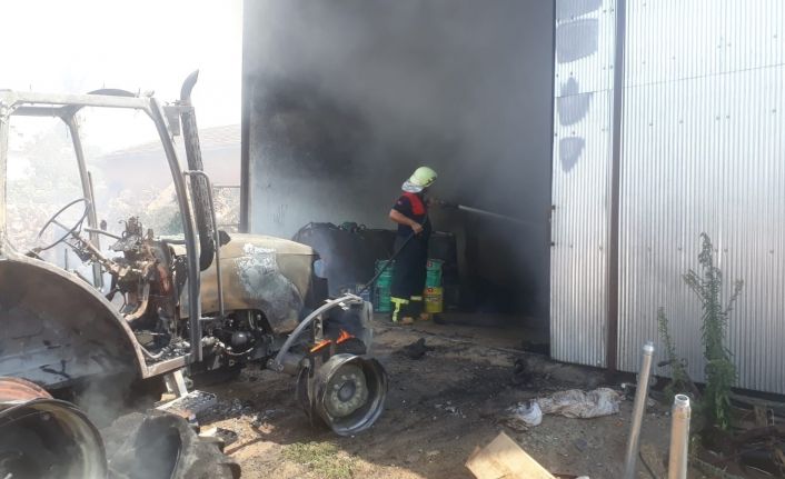 Aydın’ın Karacasu ilçesinde meydana gelen depo yangınında büyük çapta maddi hasar meydana gelirken, bir traktör de tamamen yanarak demir yığınına döndü.