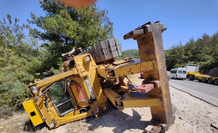 Aydın’ın Kuşadası ilçesinde meydana gelen kazada iddiaya göre yangın ihbarına giden orman işletmeye ait tırın üstündeki dozer virajda yola savrularak devrildi.