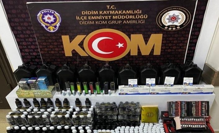 Aydın’ın Didim ilçesindeki bir işyerinde yapılan aramalarda, çok sayıda kaçak içki ve sigara ele geçirildi.