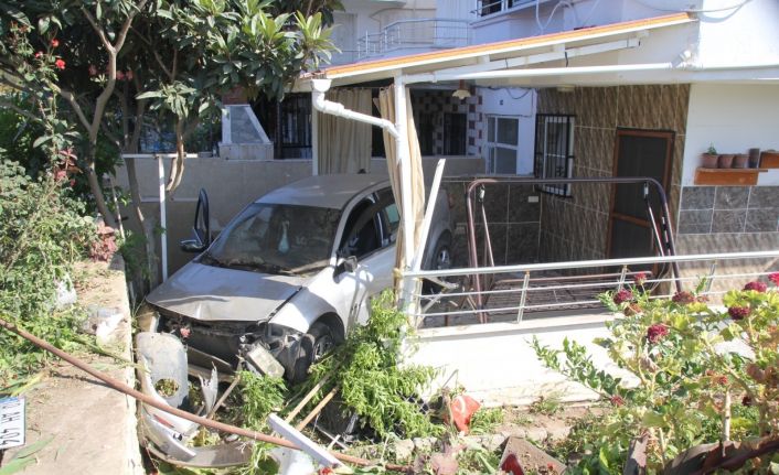 Aydın’ın Didim ilçesinde meydana gelen kazada direksiyon hakimiyetini kaybeden otomobil yoldan çıkarak bir evin bahçesine uçtu, sürücü kazayı yara almadan atlattı.