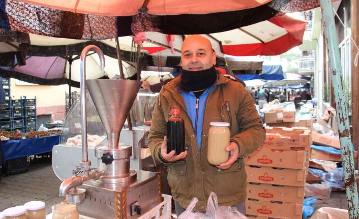 Aydın’da sıfır derecenin altına inen hava sıcaklıkları nedeniyle etkili olan soğuk hava vatandaşlar soğuktan korunmak için farklı yöntemlere başvurmaya başladı. Soğuk hava vatandaşları tahin ve pekmeze yöneltirken, vücut ısısını koruyan ve uzun süre tokluk hissi veren ürünelere talep arttı. Susam tohumunun ezilmesinden elde edilen tahin, vatandaşlar tarafından severek tüketiliyor. Genellikle içerisine pekmez karıştırılarak kış aylarında sofralarımıza gelen tahin ve pekmez karışımı tam bir şifa deposu. Bağışıklık sistemini güçlendiren ve insan vücudunu hastalıklara karşı koruyan en güçlü besinlerden olan tahin pekmez, vücudu toksinlerden arındırarak hastalıklara karşı koruyor. Pazarlarda sıcak tahin satışı yaparak geçimini sağlayan Süleyman Kabakçı, tahini vatandaşların gözü önünde ürettiklerini ve tamamen organik olduğunu ifade ederek, "Bizim ürettiğimiz yüzde yüz sadece susamdan yapılan organik sıcak tahindir. Susamın kavurmasına, işlenmesine ve yıkanmasına kadar hepsi bizim elimizden geçiyor. İçerisinde kimyasal, koruyucu ve renklendirici gibi herhangi hiç bir şey yok. Pazarlarda vatandaşların gözü önünde sıcak üretim yapıyoruz" dedi.