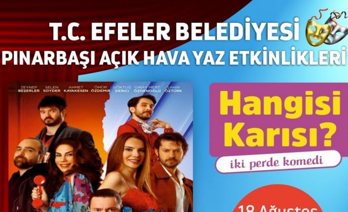 Efeler Belediyesi tarafından düzenlenen Pınarbaşı Açık Hava Yaz Etkinlikleri çerçevesinde ünlü oyuncuların yer aldığı ’Hangisi Karısı?’ isimli oyun, Efelerli tiyatroseverlerle buluşacak.
