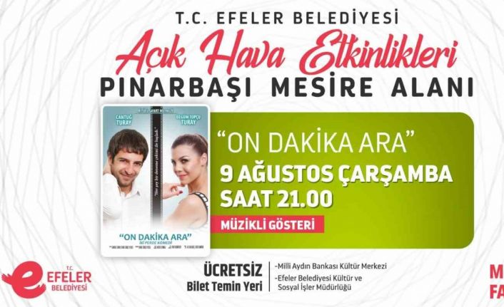 Göreve geldiği günden bu yana hayata geçirdiği projeler ile Efeler’i “Marka Kent” yapmak için çalışan Başkan Atay, temel belediyecilik hizmetlerinin yanı sıra şehirde çok sayıda kültür sanat etkinliğine öncülük ediyor. 9 Ağustos Çarşamba Günü saat 21.00’de Pınarbaşı Mesire Alanı’nda gerçekleştirilecek etkinlikler çerçevesinde ekranlardan tanıdığımız Cantuğ Turay ve Begüm Topçu Turay “On Dakika Ara” isimli müzikli eğlencede, sürpriz performansları, anlatıları ve müzikleri ile izleyicilere keyifli anlar yaşatacak.