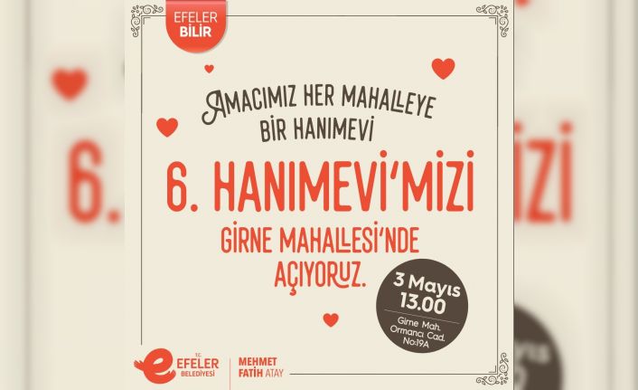 Efelerli kadınların uğrak noktası olan, konforlu ortamı ve ücretsiz ikramları ile misafirlerin hoş vakit geçirmesini hedefleyen Hanımevlerinin 6’ncısı 3 Mayıs Çarşamba günü saat 13.00’te Girne Mahallesi Ormancı Caddesi Numara 19’da düzenlenecek olan törenle hizmete sunulacak. 6’ıncı Hanımevi’nin açılışına tüm vatandaşları davet eden Efeler Belediye Başkanı Mehmet Fatih Atay, “Efeler’de yaşayan ve ilçemizi ziyaret eden kadınların hoşça vakit geçirebildikleri Hanımevlerimize bir yenisini daha ekliyoruz. Kadınların hayatın her alanında daha sosyal ve özgür olmalarını hedefliyoruz.. Bu çerçevede hayata geçirdiğimiz ve 6’ncısını hizmete açacağımız Hanımevi’mizin açılışına tüm Efeler halkını davet ediyorum” diye konuştu.