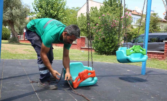 Efeler Belediye Başkanı Mehmet Fatih Atay’ın talimatıyla, Park ve Bahçeler Müdürlüğü’ne bağlı ekipler, belediyenin sorumluluk alanında bulunan parklarda bakım, onarım, yenileme ve temizlik çalışmalarına devam ediyor. Efeler’deki çocukların daha güvenli ve sağlıklı bir ortamda gönüllerince koşup oynayabilmeleri için ekiplerin yoğun mesai harcadığını belirten Efeler Belediye Başkanı Mehmet Fatih Atay, “Ekiplerimiz sahada parklarımızın kontrolünü sağlıyor. Yıpranan, bakım gerektiren çocuk oyun gruplarımız yenileniyor. Tazyikli ve köpüklü sularla da yıkanıp temizliği sağlanıyor. Parklarımızdaki çocuk oyun gruplarının zeminine kauçuk kaplama yapılıyor, oluşturulan yumuşak zemin ile çocukların daha güvenli şekilde eğlenip, oyun oynayabilmeleri sağlanıyor. Yüksek derecelere ulaşan hava sıcaklığına rağmen gerçekleştirilen özverili çalışmalarda parklarımızın çevresi ile oturma alanları da temizlenerek Efeler halkımızın kullanımına sunuluyor" diye konuştu.