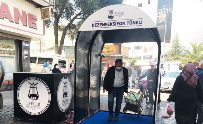 Efeler Belediyesi, pazaryerlerindeki korona virüs tedbirlerini sürdürüyor. Salı Pazarı’na belediyenin kendi imalatı olan dezenfeksiyon tüneli kuruldu.