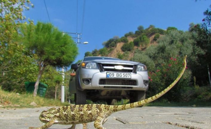 Aydın’ın Kuşadası ilçesi Kirazlı yolunda yoğun olarak görülen bukalemunların, araçlar tarafından ezilmemesi için duyarlılık çağrısı yapan EKODOSD Başkanı Bahattin Sürücü; “Onlar sizin kadar hızlı değil. Gelin bukalemunların yaşamını şansa bırakmayalım” dedi.
