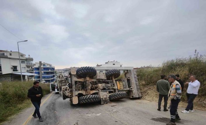 Aydın’ın Kuşadası ilçesinde, özel bir firmaya ait iş makinesi frenlerinin boşalması sonucu devrildi.