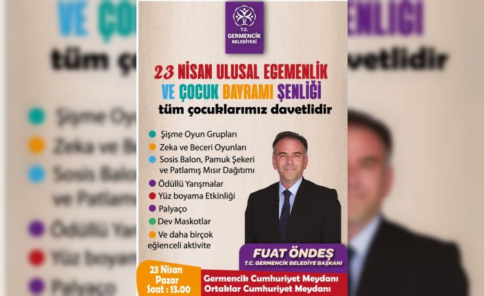 Germencik’te iki gün boyunca düzenlenecek olan etkinliğe çocuklar ile aileleri davet eden Belediye Başkanı Fuat Öndeş, “Kıymetli çocuklar 23 Nisan Ulusal Egemenlik ve Çocuk Bayramı’nda Germencik ve Ortaklar Cumhuriyet Meydanında saat 13.00’da başlayacak olan çocuk şenliğine davetlisiniz. Birbirinden eğlenceli aktiviteler, oyun grupları, palyaço ve maskotlar, ödüllü yarışmalar ve ikramların olduğu eğlence dolu bir gün sizleri bekliyor. Çünkü bu sizin bayramınız. Kutlu olsun” ifadelerini kullandı.
