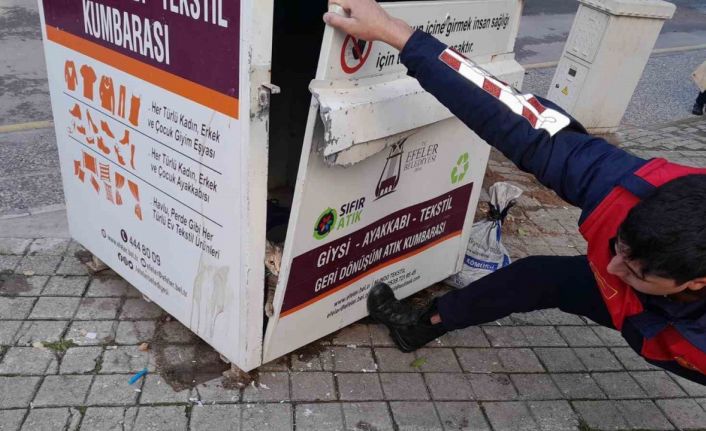 Aydın’ın Efeler ilçesinde giysi kumbarasında mahsur kalan kediyi itfaiye ekipleri giysi kumbarasının kilidini kırarak kurtardı.