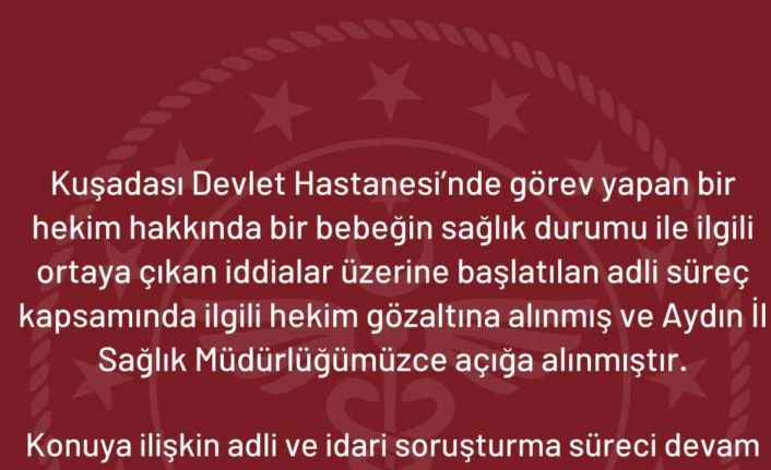 İl Sağlık Müdürlüğü’nden yapılan açıklamada, "Kuşadası Devlet Hastanesi’nde görev yapan bir hekim hakkında bir bebeğin sağlık durumu ile ilgili ortaya çıkan iddialar üzerine başlatılan adli süreç kapsamında ilgili hekim gözaltına alınmış ve Aydın İl Sağlık Müdürlüğümüzce açığa alınmıştır. Konuya ilişkin adli ve idari soruşturma süreci devam etmekte olup, gelişmeler müdürlüğümüz tarafından hassasiyetle takip edilmektedir. Kamuoyuna saygıyla duyurulur" denildi.