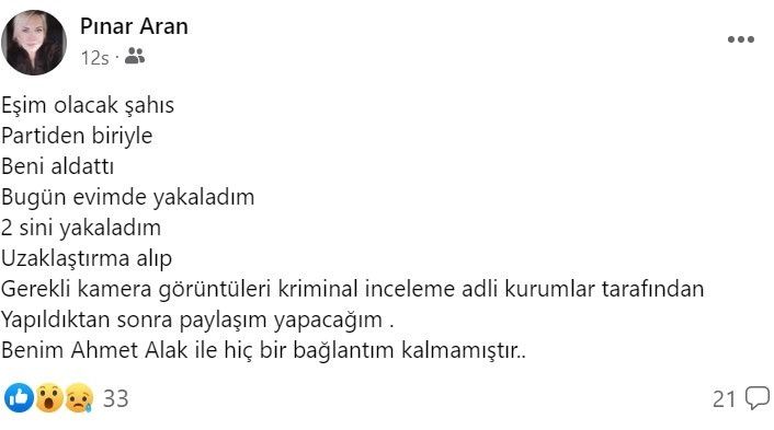 Aydın’ın İncirliova ilçesinde, İYİ Parti İlçe Başkanı Ahmet Alak’ın eşi Pınar Aran Alak sosyal medya paylaşımı ile partiyi sarsmıştı. Eşinin kendisini partili bir kadınla aldattığını ileri süren Pınar Aran Alak’ın sosyal medya paylaşımı üzerine Başkan Alak, İYİ Parti İncirliova ilçe başkanlığı görevinden, aldatıldığını ileri süren eşi Pınar Aran Alak ise parti üyeliğinden istifa etmişti. Pınar Aran Alak, olayın üstünden sekiz gün geçtikten sonra bu sefer, sosyal medya paylaşımında olayı yanlış anladığını söyledi.
